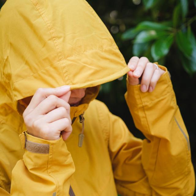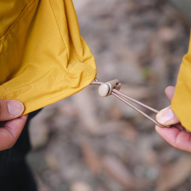 深めに作られたフードは、ジッパーの左右と後頭部にドローコード、フードの縁部分にワイヤーが入り、それらを調整することでより機能的に雨風を凌ぐことができます。