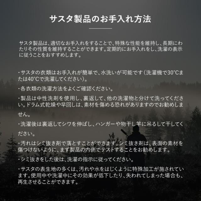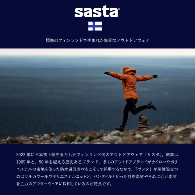 北極圏が目前の北緯64度に位置し、北ヨーロッパ最後の原野地域に囲まれた街・ヌルメスに本拠地を構える、フィンランドのアウトドアウェアブランド「サスタ」。創業者が自身で使用するために作ったハンティングウェアが評判を呼び、50年以上に渡り無骨で実直なものづくりを続けているブランドです。 極寒のフィールドにてテストを重ねたウェアの数々は、単なるファッションアイテムではなく、過酷な自然環境下でも機能する妥協のない「ギア」と言えます。 必ずしも最新の化学繊維に頼るのではなく、あえて天然繊維を採用するなど、北欧の環境にマッチした適切な素材選びを徹底。環境に負荷をかけないリサイクル素材も積極的に取り入れています。時代にとらわれないものづくりは、高品質で機能的、かつ高い耐久性を備えたプロダクトへと昇華し、世界中のハンターやアウトドア愛好家たちから、熱い信頼を寄せられています。