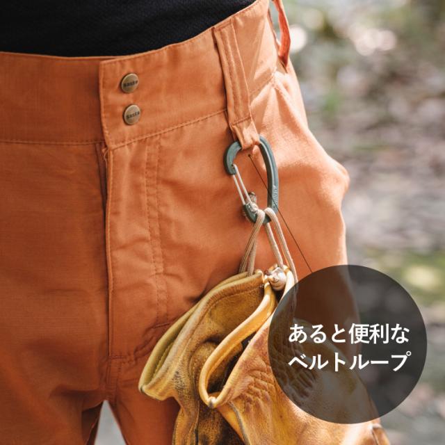 フロント部の2つのベルトループに付属した小さなホールは、カラビナをかけたりキーリングを付けたり、マルチに使うことができます。