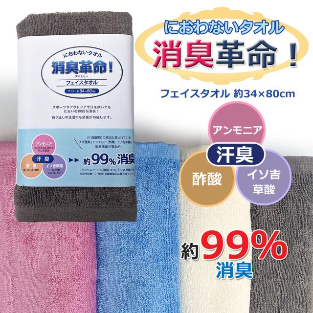 【消臭革命 フェイスタオル】 におわないタオル デオスリー 汗臭い 綿100% におわない 汗 抗菌 防臭 夏 梅雨 消臭機能 部屋干し 乾きやすい ギフト対応可 送料無料 洗顔タオル 普通サイズ