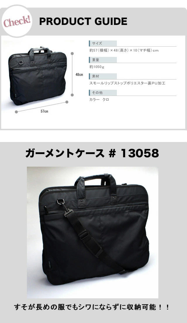 ![]() ![]() ![]() ![]() ![]() ![]() ガーメントバッグ 13058 収納力バツグン!出張にベンリな多機能ガーメントバッグ。 シワにならずにスーツを収納できビジネスーシーンでも大活躍! 取り外し可能なハンガー2本付きでキャリーオンになるバッグ。