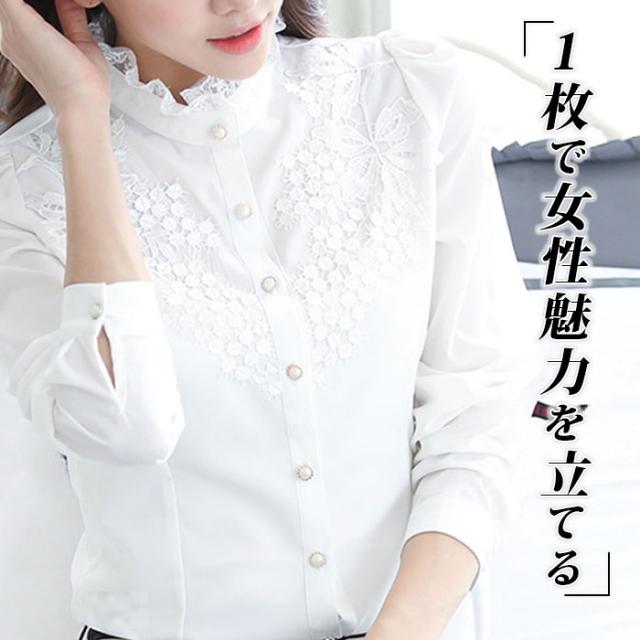 ロングブラウス レディース 長袖 詰襟フリル 襟付 シャツ ロングスリーブ オフィス カジュアル オシャレ かわいい 春 秋 ホワイト 白 エレガント 入園 卒園 入学 卒業 優雅 薄手 通勤 OL