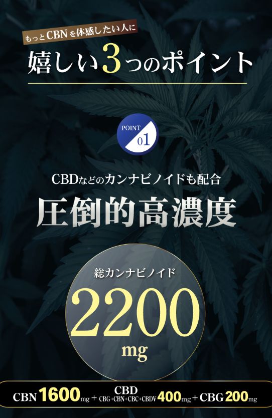 CANNACREATEならではのアントラージュ効果を更に高めるため、CBN、CBD、CBGをオリジナルブレンドしました。含有量にもこだわり、総カンナビノイド2200mgの高濃度を実現させました。