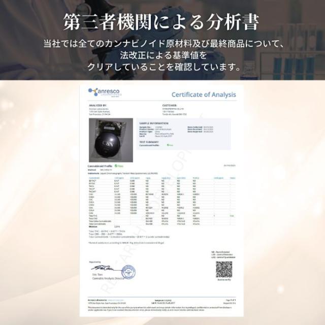 | 新基準適合 | 2024年12月12日施行された「大麻取締法及び麻薬及び向精神薬取締法の一部を改正する法律」により、CBD製品に含まれるTHCの残留値に新たな基準値が設けられました。現在、当社から販売しているすべてのカンナビノイド製品に関しましては、原材料の受け入れから最終製品の完成までに複数回の第三者機関による品質検査を実施しており、新基準値に適合していることを確認しております。これまで通り、高い品質の製品をお届けしてまいりますので、安心してご使用ください。 |
