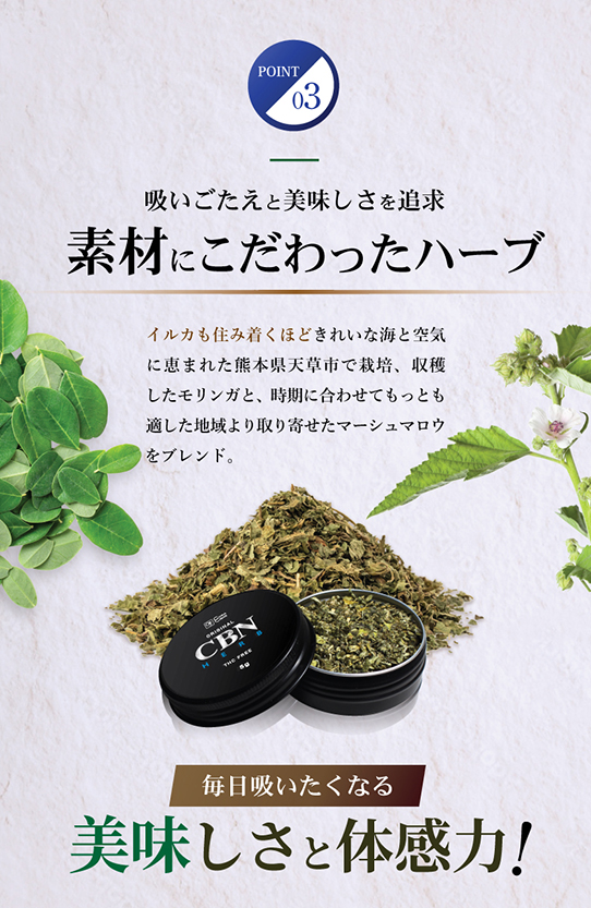 | ご使用上の注意 | カンナクリエイトのCBNハーブはニコチンを一切含みませんが、20歳以上の方がご使用されることを想定しております。 ●妊娠中、授乳中の方はご使用をお控えください。 ●お楽しみいただく際は、周囲へご配慮いただき、マナーを守ってご使用ください。 ●未成年の方への販売は行っておりません。ご使用についてもお控えください。 ●子どもの手の届かないところに保管してください。 |