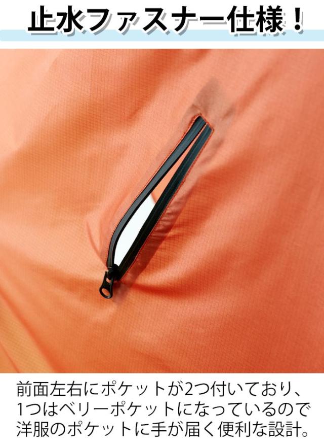撥水加工された軽いポリエステル素材でコンパクトにたたんで収納できるカラビナ付きの収納袋が付属!さらに、洋服のポケットに手が届く「ベリーポケット」など、アクティブに機能的に使えるポイントが満載です。