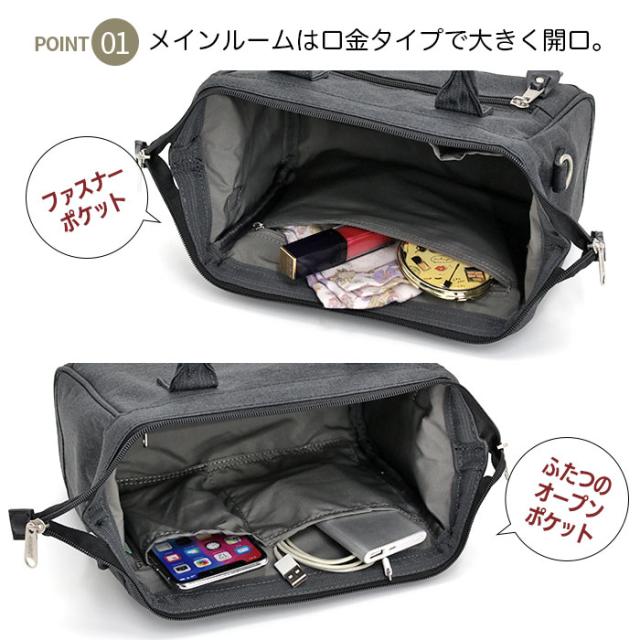 取り外しできるショルダーベルトが付属しており、手提げとしても、肩掛けや斜め掛けとしても使用できる2way仕様になっています。口金タイプの開閉は使い勝手が良く、荷物の出し入れも楽々♪