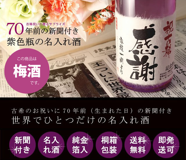 古希祝い 70年前の新聞付き名入れ酒【古希梅酒】720ml 純米大吟醸仕込みの梅酒 ギフト プレゼント 誕生日 記念品 贈答品 男性 女性 祖父 祖母 高級 父 母 義父 義母 おじいちゃん おばあちゃん 上司 恩師 先生 兄弟 親戚 桐箱入り 風呂敷包装