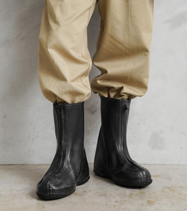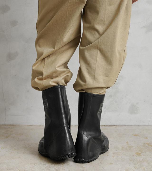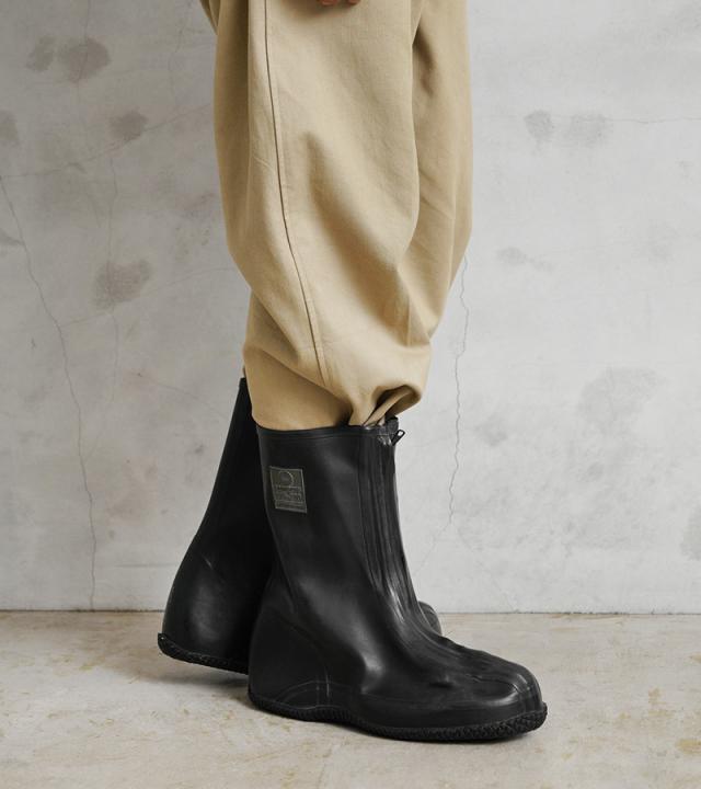 西ドイツ軍から放出の防護靴が入荷しました。静電気防止機能を備え、完全防水のオーバーシューズです。丈夫な厚手のゴムで機密性が高く、前面のジッパーで開き、靴を脱がずにプロテクターの中に入れ、ジッパーを締めることで、靴がプロテクター内に安定して収まります。日常生活ではあまり見ない、ミリタリーならではの機能性と無骨な雰囲気が魅力的。 靴のままさっと履くことができるレインブーツとしてや、災害などの緊急時の備えとしても活躍するアイテムです。
