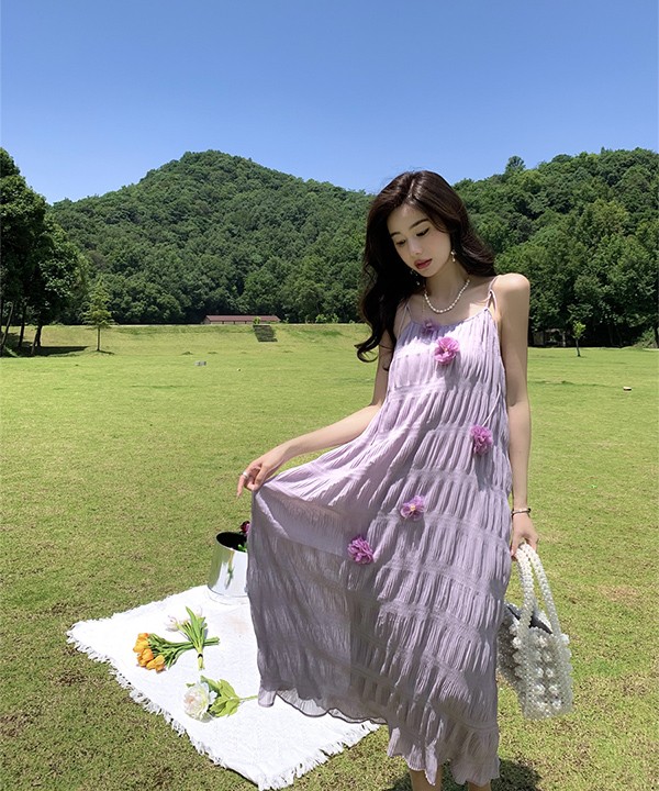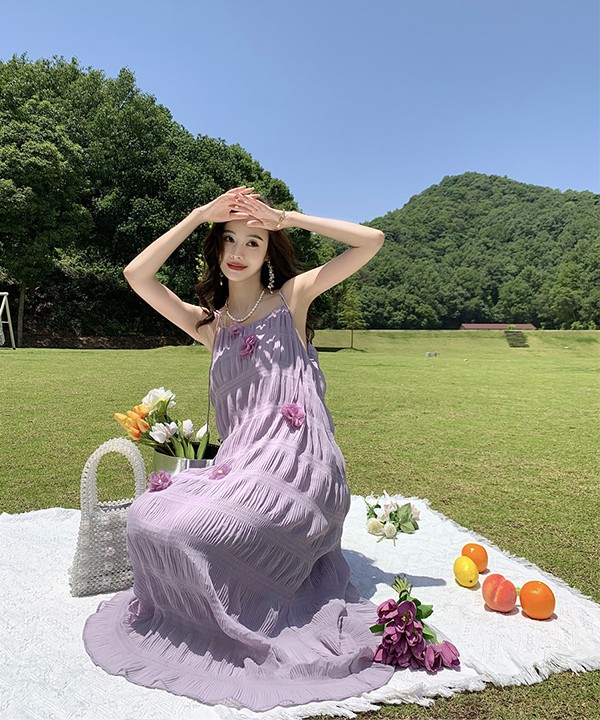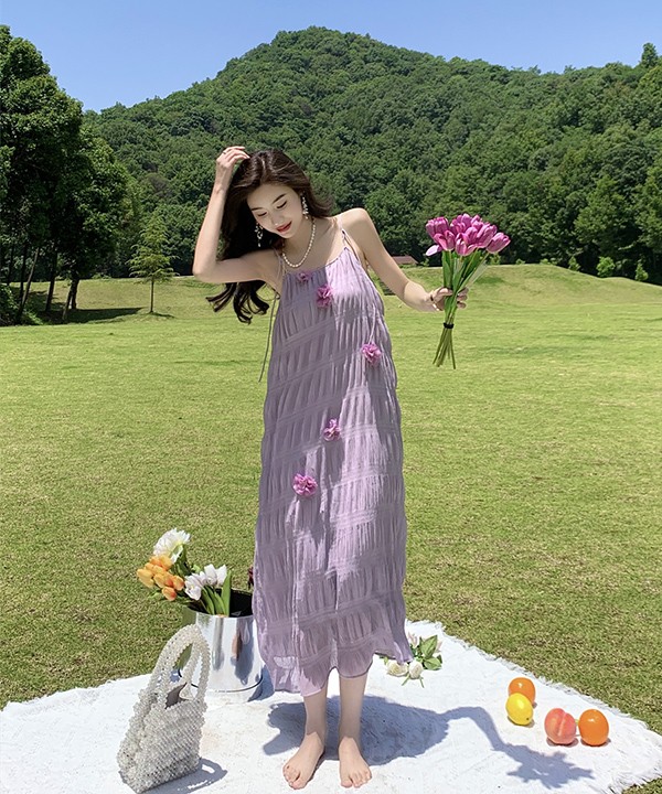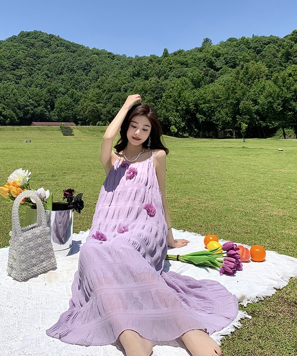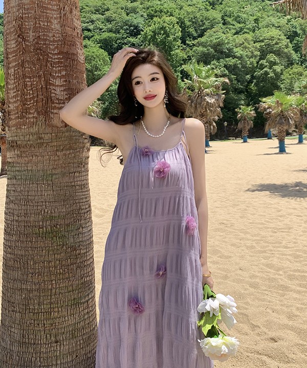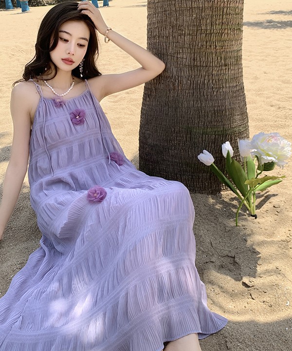 リゾートワンピース 大人可愛い 夏 ロングワンピース 花付き リゾートワンピ キャミソール マキシワンピース ハワイ ハワイアン 沖縄 体型カバー 結婚式 七五三 成人式 卒業式 入学式 Aライン 春夏おうち 無地 マキシ丈 おしゃれ 韓国 パープル S M L dd031l9l9lc