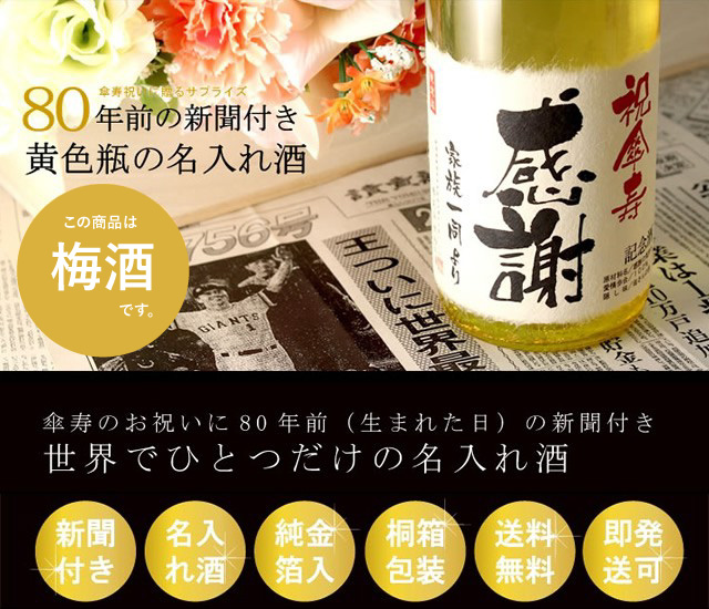 傘寿祝い 80年前の新聞付き名入れ酒【傘寿梅酒】720ml 純米酒仕込み 赤ワイン樽熟成の梅酒 ギフト プレゼント 誕生日 記念品 贈答品 男性 女性 祖父 祖母 高級 父 母 義父 義母 おじいちゃん おばあちゃん 上司 恩師 先生 兄弟 親戚 桐箱入り 風呂敷包装