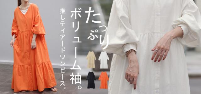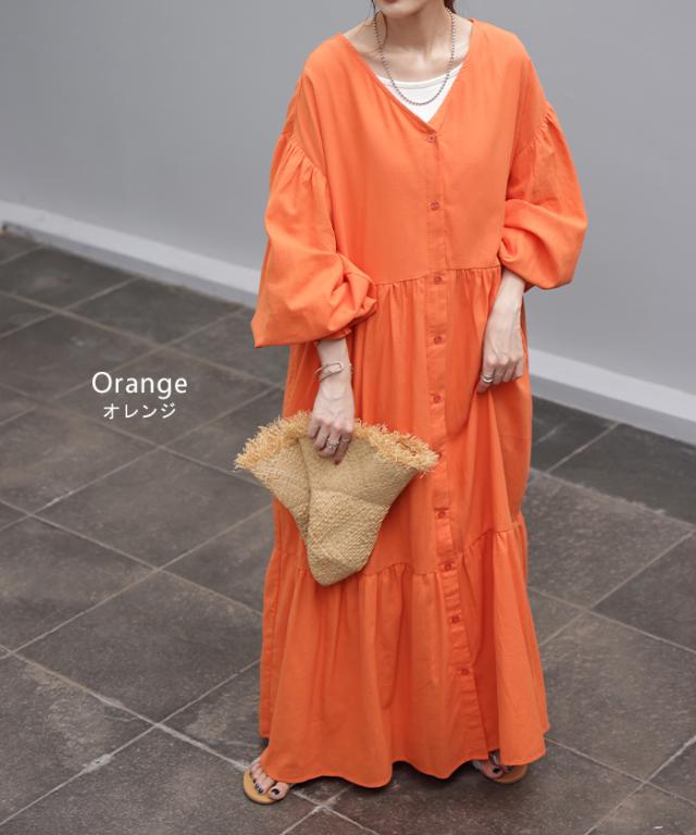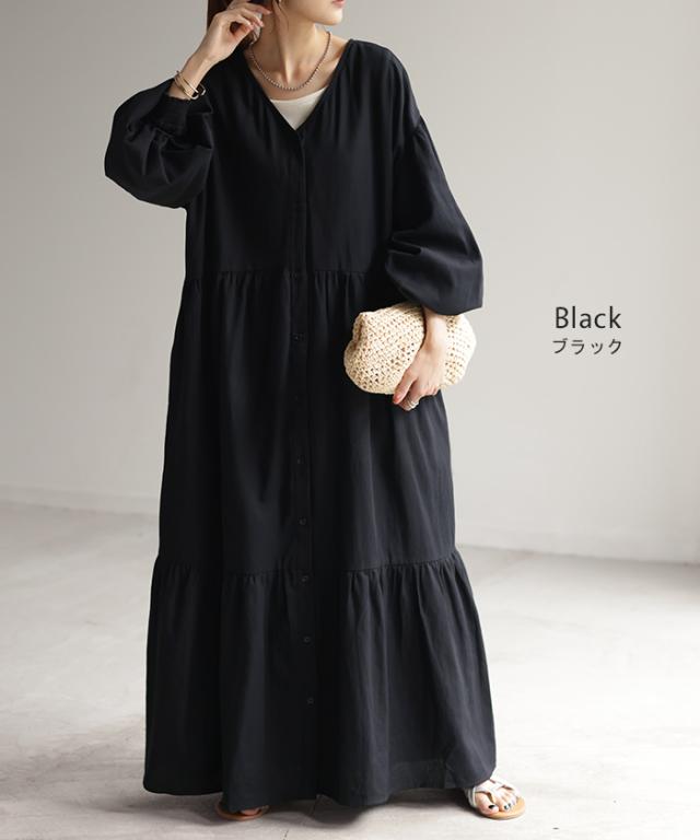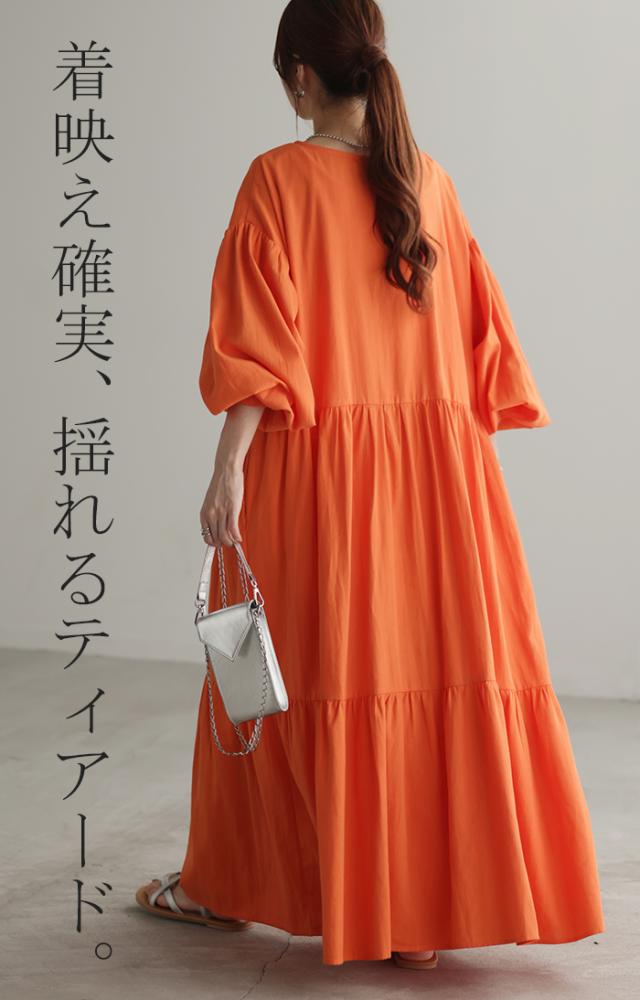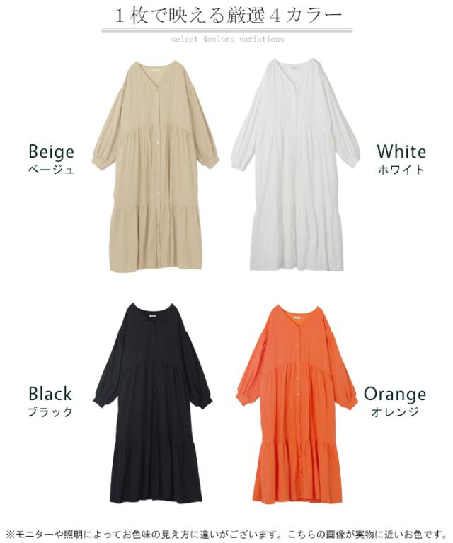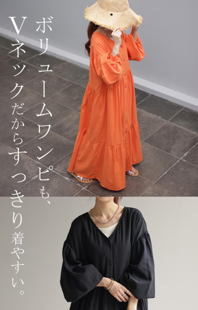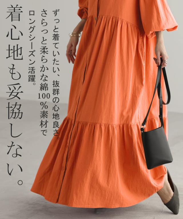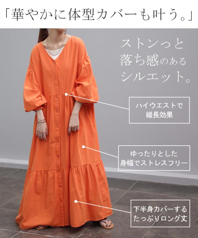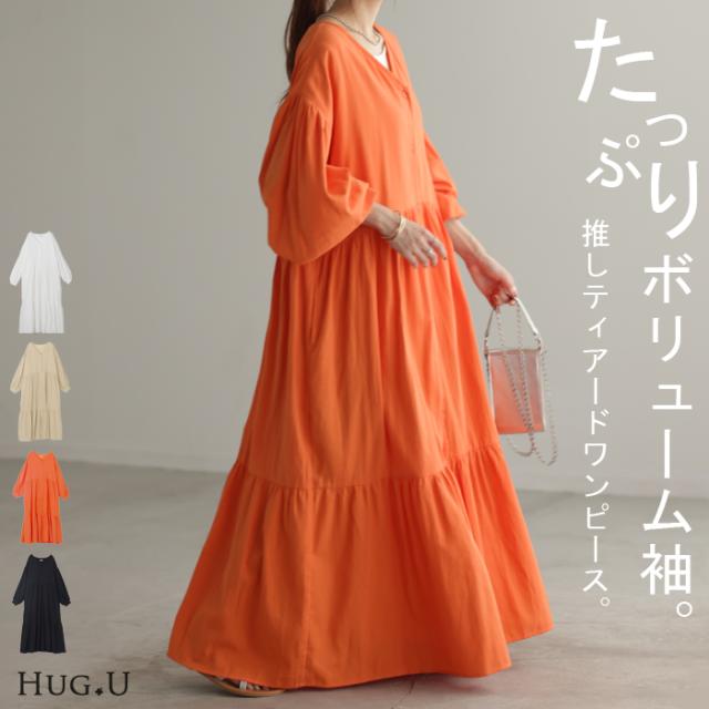 ワンピース ティアード ロング 綿100 レディース ボリューム ロングワンピース Vネック 無地 裏地 フレアワンピース フレア Aライン ギャザー ティアードワンピース シャツワンピース 長袖 体型カバー きれいめ 大きいサイズ 黒 オレンジ 春 夏 HUG.U 秋新作