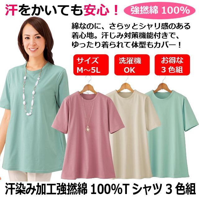 レディース 半袖 3枚組(汗染み加工 強撚綿100% Tシャツ 3色組)汗染み防止加工 汗に負けない 耐水性 吸湿性 速乾性 婦人服 サラッとした肌ざわり ローズ グレージュ ミント ゆったりシルエット プレゼント
