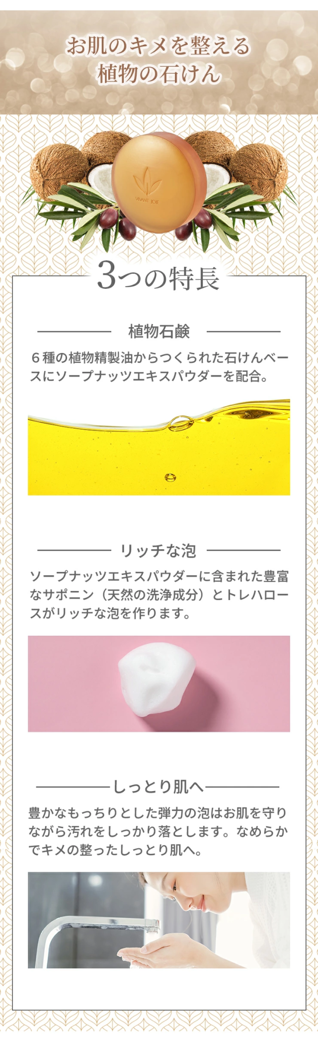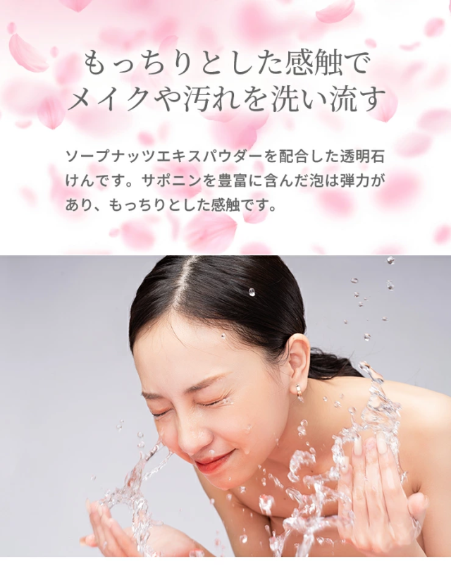 ソープナッツエキスパウダー*を配合した透明石けんです。サポニンを豊富に含んだ泡は弾力があり、もっちりとした感触でメイクや汚れを洗い流します。肌荒れを防ぎ、肌のキメを整えます。 |