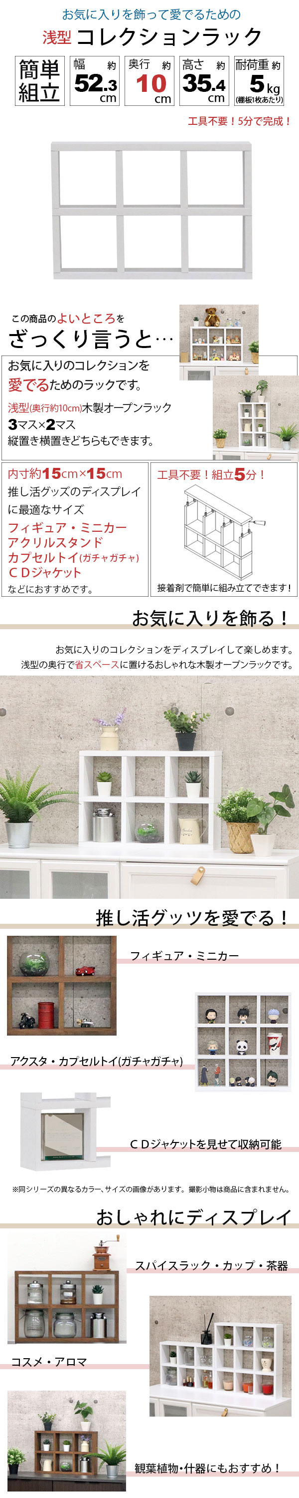 アクスタ 収納 棚 推し活 収納ラック アクスタ 飾る 棚 6マス(2段×3列) 1マス高さ15cm×幅15cm コレクションラック おしゃれ 幅52.3cm 奥行10cm 高さ35.4cm ディスプレイラック 卓上ラック 飾り棚 ガチャガチャ ミニラック デスク上 机上 ラック 木製 シンプル ホワイト 白