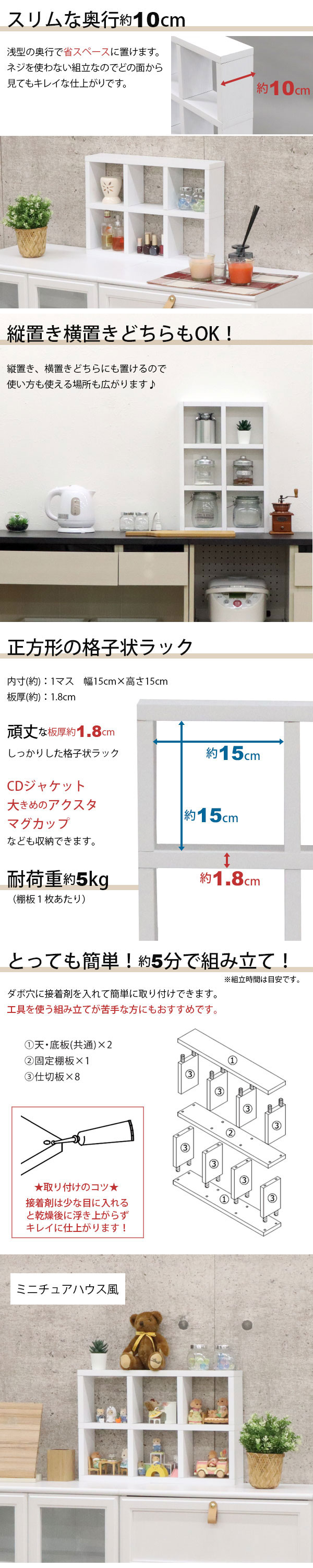 木目調 爽やか 1マスの内寸15×15cm オープンタイプのラック 板の厚み18mm 安定感 しっかり支える 簡単組み立て すぐ組み立てられる 高級感 綺麗 どちらの向きでも使える レイアウトは自由自在 いろいろな場所で使える キッチン小物 収納兼ディスプレイ 使う場所を選ばない