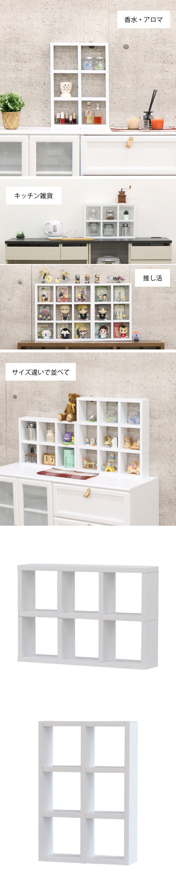 商品名:アクスタ 収納 棚 推し活 収納ラック アクスタ 飾る 棚 6マス(2段×3列) 1マス高さ15cm×幅15cm コレクションラック おしゃれ 幅52.3cm 奥行10cm 高さ35.4cm ディスプレイラック 卓上ラック 飾り棚 ガチャガチャ ミニラック デスク上 机上 ラック 木製 シンプル ホワイト 白 縦置き横置きOK 卓上 オープンラック 2x3 家具 インテリア 収納家具 収納 棚 スリム 背板なし 小物収納 マルチラック フリーラック 調味料ラック スパイスラック フラワースタンド 花台 プランターラック コスメ収納 化粧品 雑貨 おもちゃ 推しグッズ アクリルスタンド カプセルトイ 食玩 ぬいぐるみ フィギュア ミニチュア 新生活 一人暮らし ワンルーム リビング キッチン 玄関 子供部屋 棚上収納 ナチュラル かわいい 北欧風 木目 オークホワイト柄 すっきり 整理整頓 縦横自在 組立簡単 魅せる収納