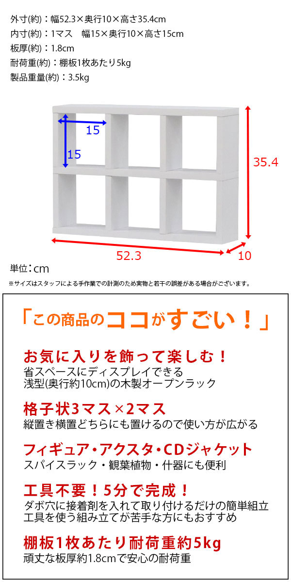 簡単組立 幅約52.3 奥行約10cm 高さ35.4cm 耐荷重約5kg(棚板枚あたり)