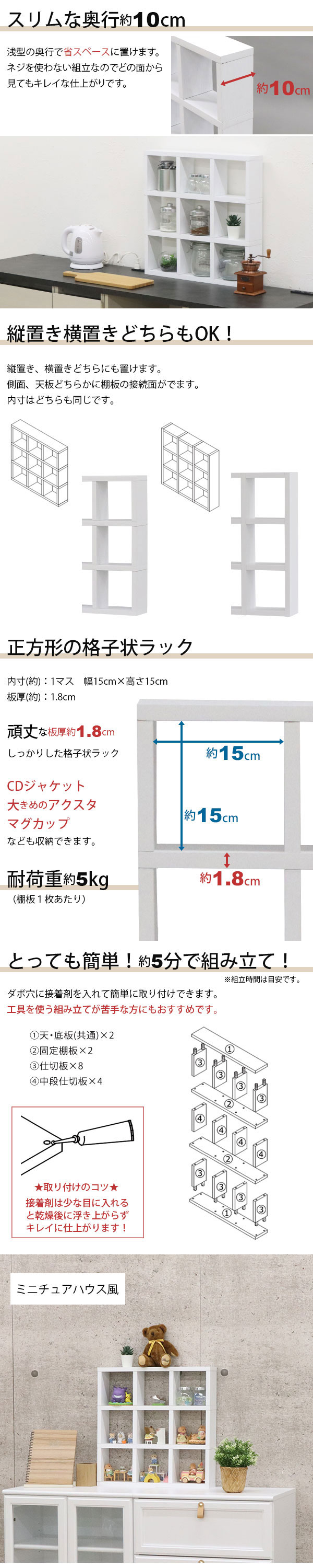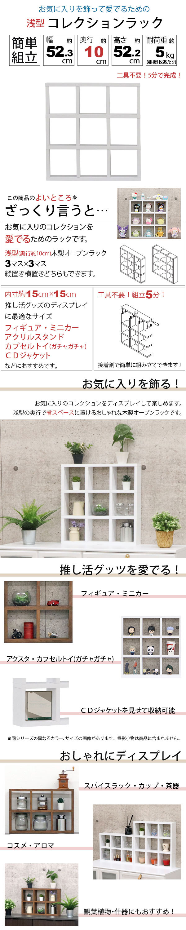 アクスタ 収納 棚 推し活 収納ラック アクスタ 飾る 棚 9マス(3段×3列) 1マス高さ15cm×幅15cm コレクションラック おしゃれ 幅52.3cm 奥行10cm 高さ52.2cm ディスプレイラック 卓上ラック 飾り棚 ガチャガチャ ミニラック デスク上 机上 ラック 木製 シンプル ホワイト 白 縦置き横置きOK 卓上 オープンラック 3x3 家具 インテリア 収納家具 収納 棚 スリム 背板なし 小物収納 マルチラック フリーラック 調味料ラック スパイスラック フラワースタンド 花台 プランターラック コスメ収納 化粧品 雑貨 おもちゃ 推しグッズ アクリルスタンド カプセルトイ 食玩 ぬいぐるみ フィギュア ミニチュア 新生活 一人暮らし ワンルーム リビング キッチン 玄関 子供部屋 棚上収納 ナチュラル かわいい 北欧風 木目 オークホワイト柄 すっきり 整理整頓 縦横自在 組立簡単 魅せる収納