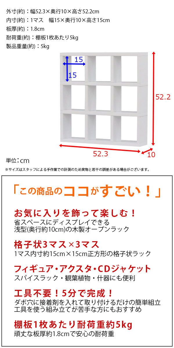 簡単組立 幅約52.3cm 奥行約10cm 高さ約52.2cm 耐荷重約5kg(棚板1枚あたり)