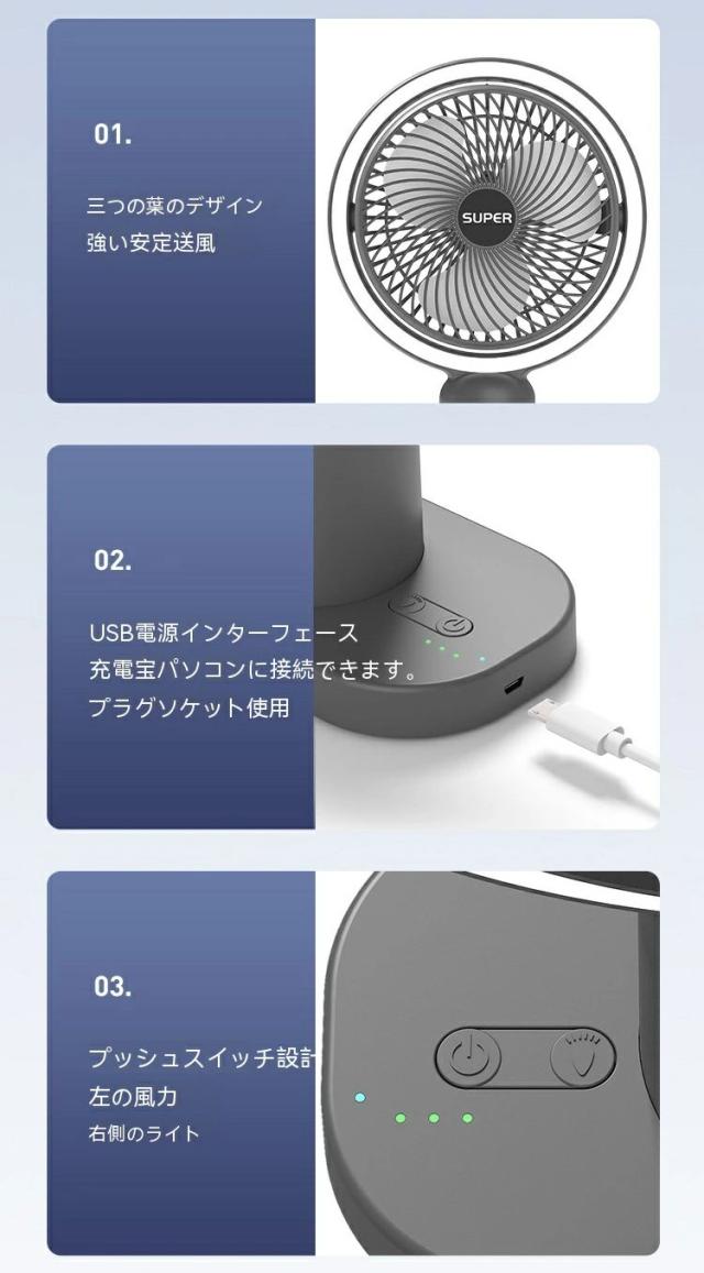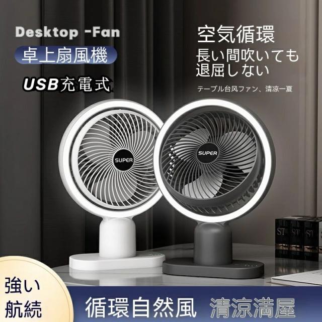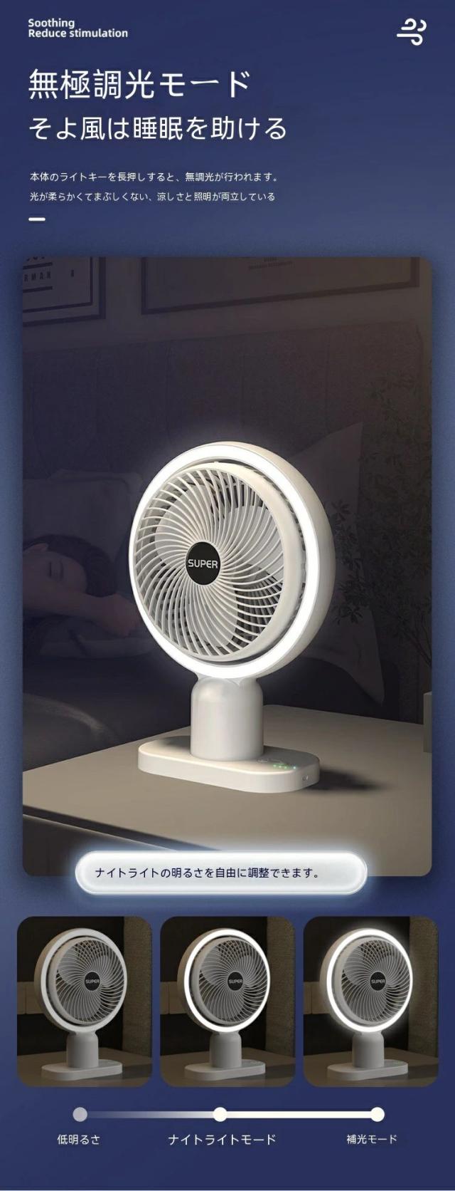 卓上扇風機 充電式扇風機 アウトドア扇風機 1000mAh大容量 静音 強力 卓上ナイトライト扇風機 ファン 自動首振りデザイン 大風量 ポータブル 小型 卓上 リビング 風量3段階調節 ライト付き 長時間連続使用 熱中症対策 多機能ファン