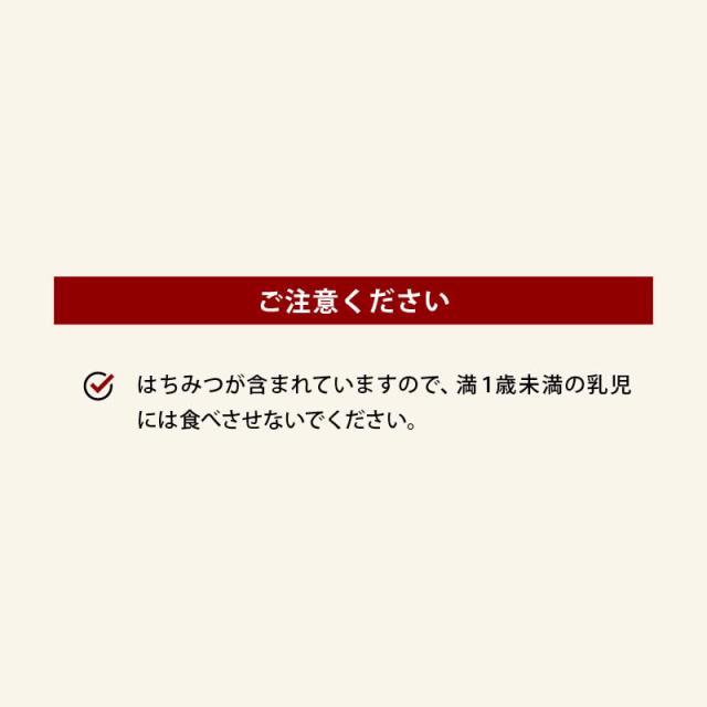 ◆本商品に含まれているアレルゲン(特定原材料等):該当なし。※はちみつが含まれていますので、満1歳未満の乳児には食べさせないでください。