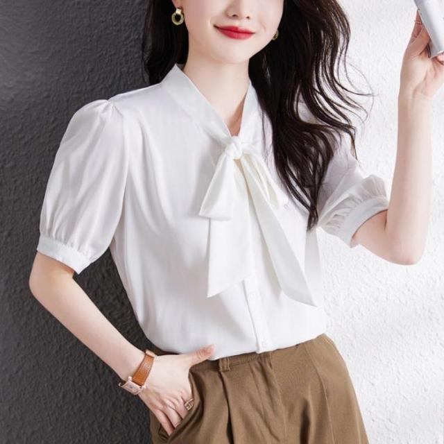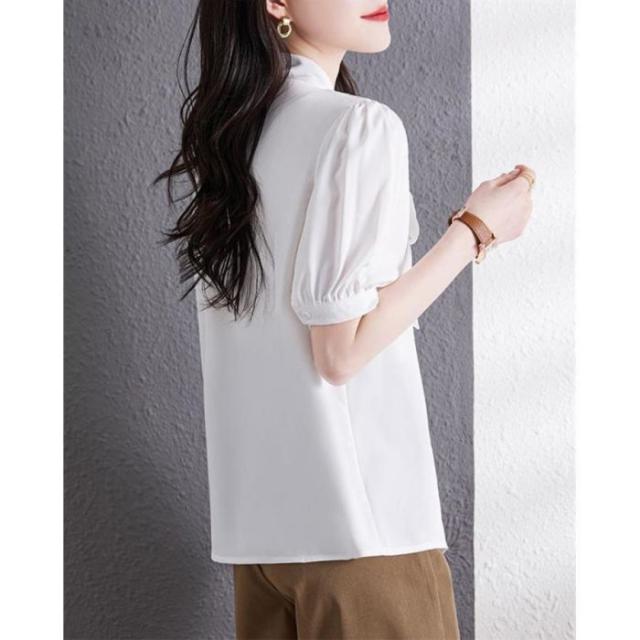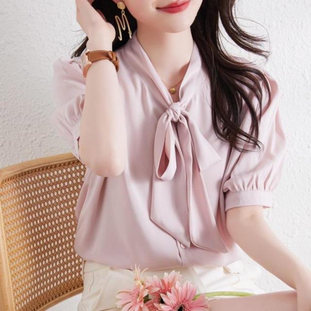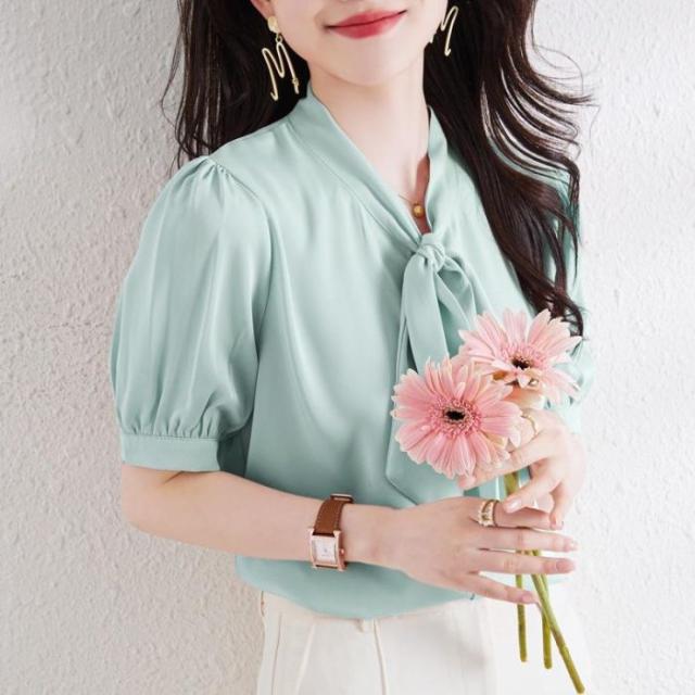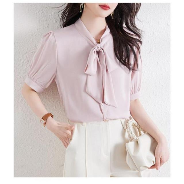 セール ブラウス 半袖 レディース シャツ トップス 切替 カットソー 重ね着 リボン 通勤 春夏 Tシャツ 柔らかい チュニック ふわっと