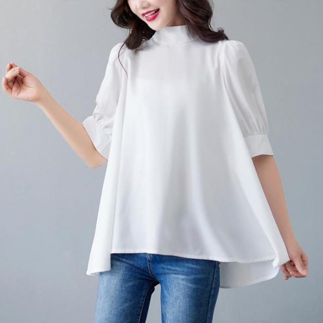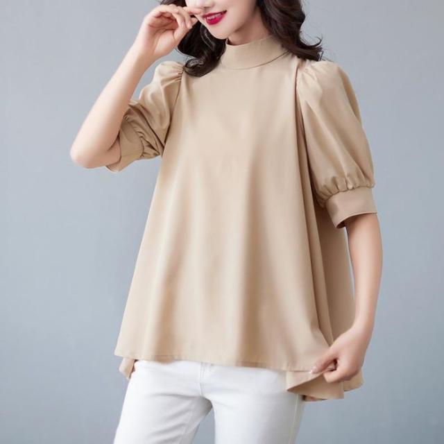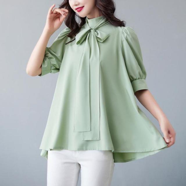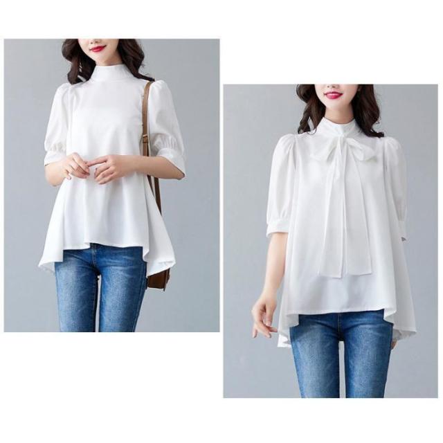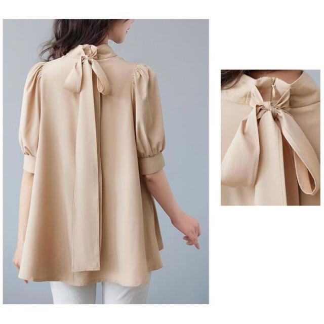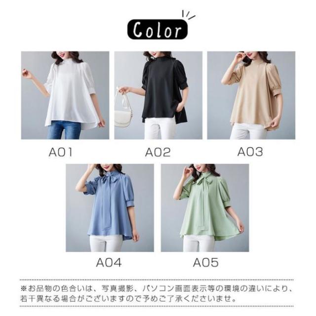激安 ブラウス 半袖 レディース シャツ トップス おしゃれ カットソー ぽわん袖 ハイネック Tシャツ リボン付き チュニック ゆったり