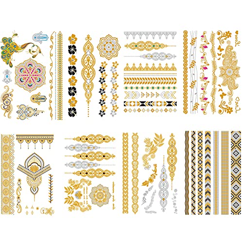 タトゥーシール ゴールド キラキラ リアル 大判 8枚セット メタル 星 羽 海 花 輝く 刺青シール 入れ墨シール ボディーシール レディー