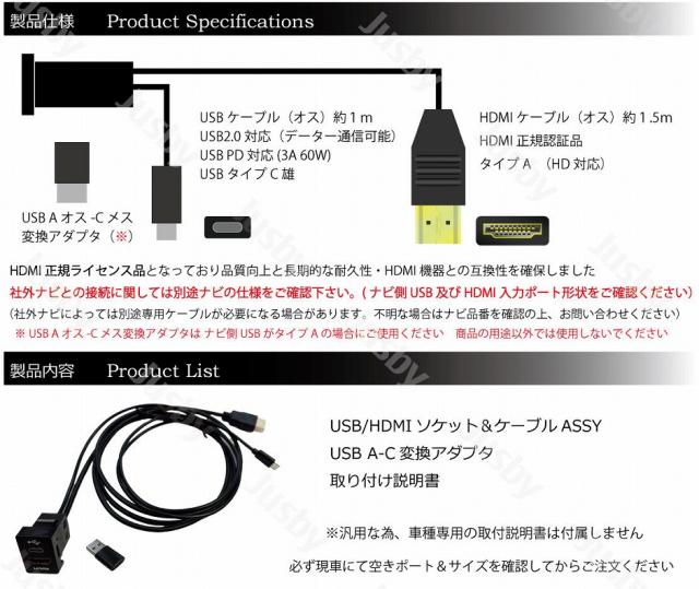 | Jusby製オリジナル USB/HDMIソケット(USB タイプC & HDMI, SPEC A (33×23mm))です 車種に応じたサービスホール(スペアスイッチホール)にUSBとHDMIをインストール可能になります USB及びHDMIをカーナビと接続してHDMI入力やCAR PLAY/Android AUTO等をスマートにアクセス可能となります HDMI入力によりスマートフォンとのミラーリングやFire TV、携帯ゲーム機、DVD機器等 HDMI入力可能な機器とナビをスマートに接続可能となり、YouTubeやNetflix等、様々な動画コンテンツもナビ画面で閲覧可能となります 当社HDMIはHDMI正規ライセンス品となっております。互換性や品質&長期的な耐久性があります。※非ライセンス品は取締り対象商品です 商品は購入から2年間の保証付きで安心してご使用いただけます。※保証書は付属しません 注文番号で対応可能です 注意 適合車種でも純正オプションやTVキャンセラーなどでサービスホールが使用済みな場合があります 必ず実際の車両に該当サイズのサービスホールの有無&位置を確認してからご注文ください 適合車種 (一部抜粋) 86/BRZ C-HR FJクルーザー GR86/BRZ ヤリス/GRヤリス/ヤリスクロス RAV4 RAV4 SAI bZ4X アイシス(Isis) アクア(AQUA) アクア(AQUA) アベンシス(AVENSIS) アルファード 20系 アルファード 30系 イスト(ist) ウィッシュ (WISH)10系 ウィッシュ (WISH)20系 ヴォクシー (VOXY) 70系/80系 エスクァイア エスティマ オーリス カムリ カローラ(スポーツ/ツーリング) カローラフィルダー カローラルミオン クラウン 30系(クロスオーバー) コペン(GR) シエンタ タンク/トール/ジャスティ ノア (NOAH) 70系/80系 ハイエース ハイラックス ハリアー 60系 パッソ ピクシス(メガ) ブレイド プリウス 30系 プリウスα 40系 プリウス 50系(前期) プリウス 50系(後期) プリウス 60系 プレミオ プロボックス ポルテ マークX マークXジオ ラクティス ランドクルーザー 200系 ランドクルーザー 300系 ランドクルーザープラド ルーミー ヴィッツ(Vitz) ヴェルファイア 20系 ヴェルファイア 30系(前期) ヴェルファイア 30系(後期)アトレー アルティス(SAI) ウェイク(WAKE) キャスト(CAST) コペン タント/シフォン トール ハイゼット ブーン ミライース ムーブキャンバス ムーヴ ロッキー 送料無料は「ネコポス便」発送のみ適用となります。 「代金引換」は送料無料適用外ですのでご注意下さい |