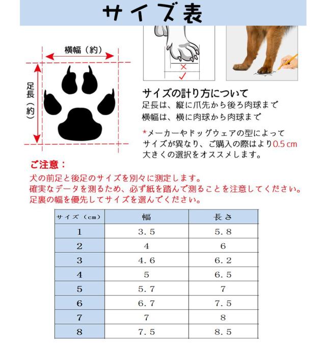 商品詳細:カラー:/A01/A02/A03/A04サイズ:/1号/2号/3号/4号/5号/6号/7号/8号【商品説明】雨の日もお出かけできる犬の靴(ドッグシューズ)防水・耐水テスト済み!耐久性にも優れた犬の靴です。前足と後ろ足のサイズをそれぞれ選んで購入できます。全8サイズからサイズを分けて選べるので、愛犬のぴったりサイズで脱げにくい!【素材】ポリエステル 、コットン【ご注意】★表記のサイズは靴の内寸です。★細かいほつれ、傷、糸の飛出しなどがある場合がございますが、予め了承くださいませ。★お品物の色合いは、写真撮影、パソコン画面表示等の環境の違いにより、若干異なる場合がございますので予めご了承くださいませ。【キーワード】男の子 女の子 オス メス 小型犬 中型犬 子犬 防寒 かわいい服 可愛い服 人気 おしゃれ いぬ トイプードル トイプー チワワ 柴犬 ポメラニアン シュナウザー ビーグル ミニチュアシュナウザー ヨークシャテリア ヨーキー シーズー マルチーズ スピッツ パグ パピヨン ピンシャー ボストンテリア