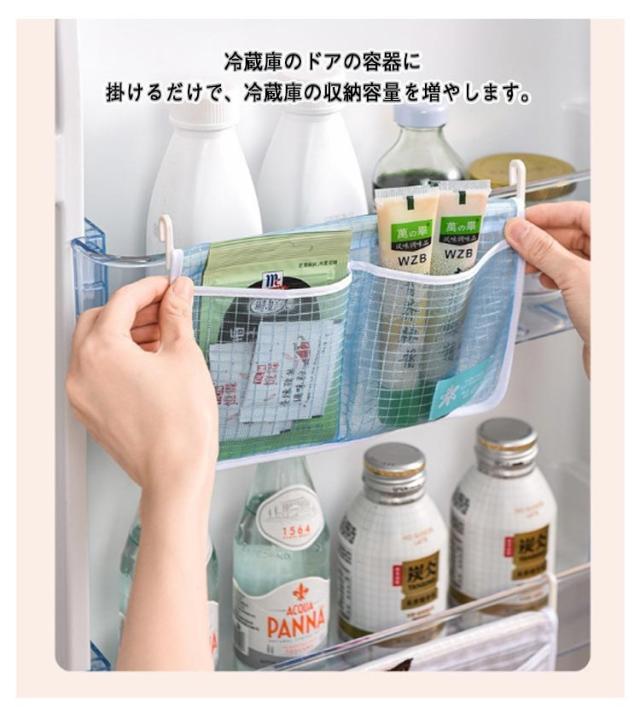 | 冷蔵庫ドアの空間を上手に利用できる収納ポケットです。 冷蔵庫のドアの容器に掛けるだけで、冷蔵庫の収納容量を増やします。 細かいメッシュを採用しており、呼吸や掃除が簡単で、長期間使用できます。 医薬品、化粧品、穀類、調味料などの日用品分類などもお使いいただけます。 取り外しも便利で、汚れた場合、水洗いで再利用可能です。 | |