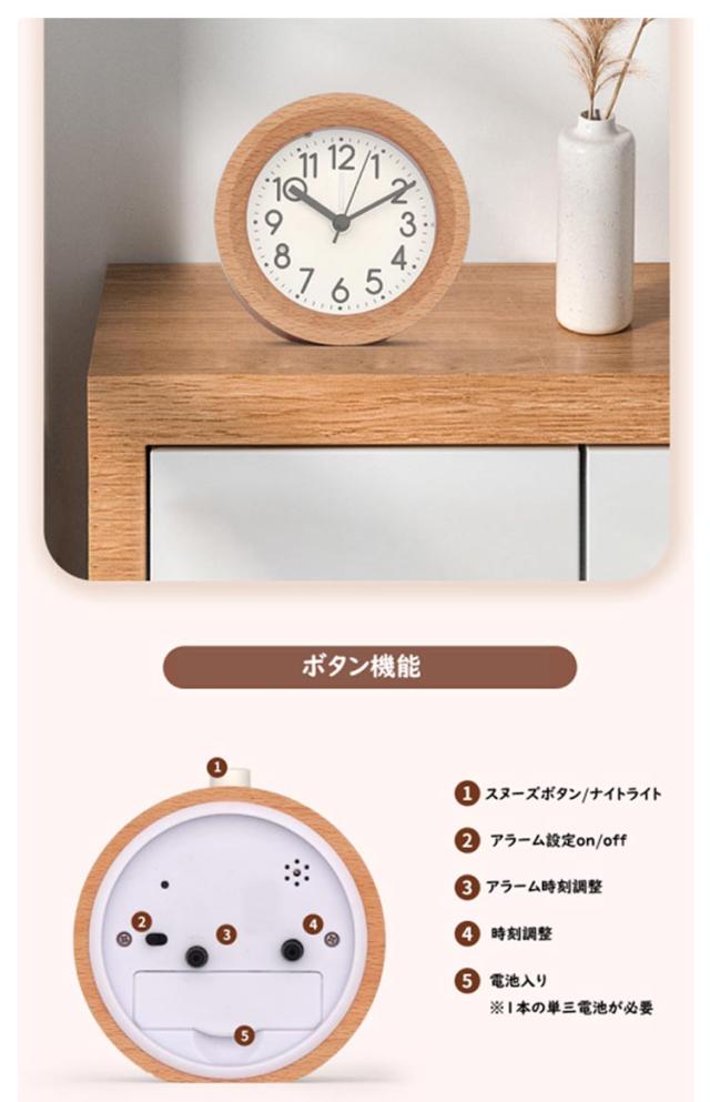 | 木製・目覚まし時計 天然木素材、安全エコ、シンプルでおしゃれ 音のしないスイーブムーブメントを備えております ナイトライト付き。暗がりでもかんたんに時間の確認ができます スヌーズモードの時に、5分間おきに鳴り出します | |