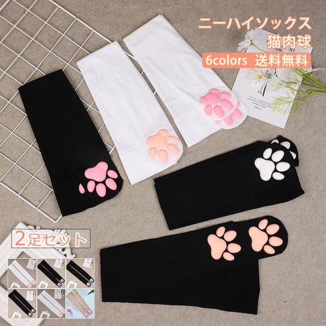 ニーハイソックス 2足セット レディース 靴下 可愛い猫肉球付き 無地 膝上 春秋 可愛い シンプル 黒 白 ルーズソックス きれいめ おしゃれ