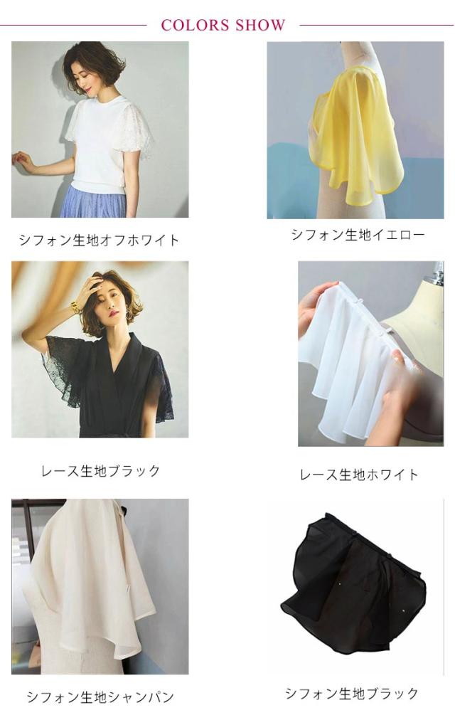 | 色 | シフォン生地オフホワイト シフォン生地イエロー レース生地ブラック レース生地ホワイト シフォン生地シャンパン シフォン生地ブラック |