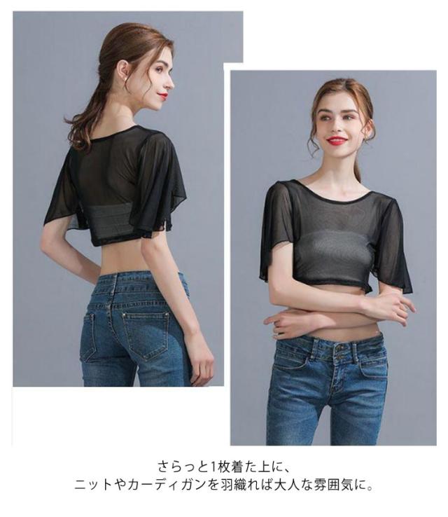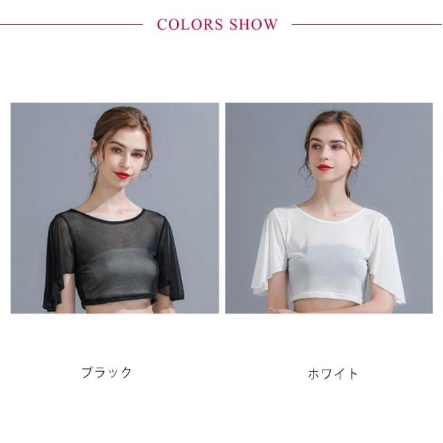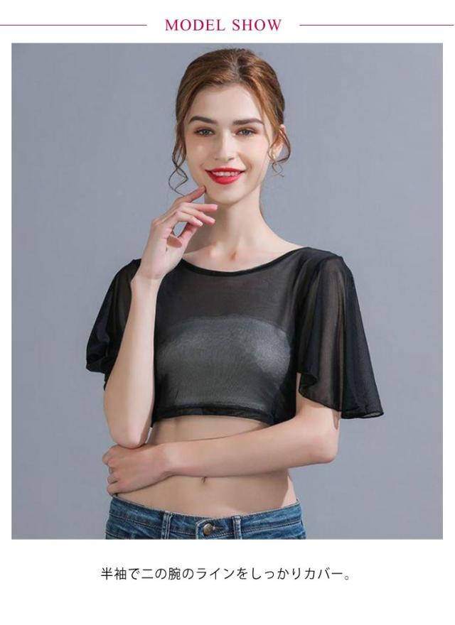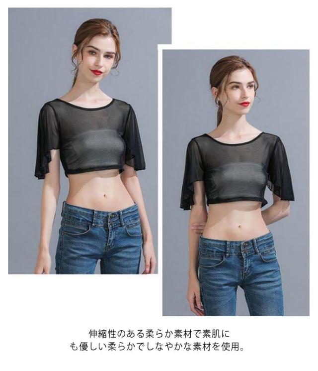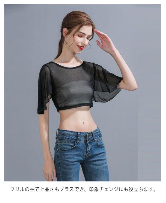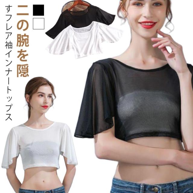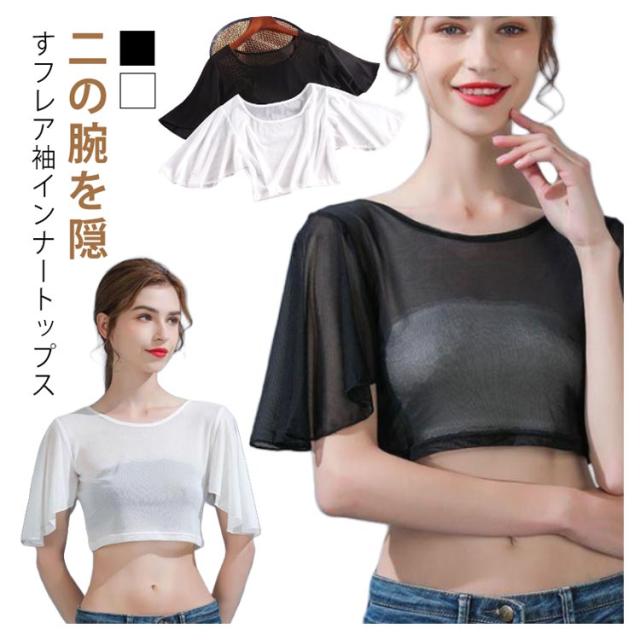 フリル 隠し 重ね着 付け袖 半袖 着痩せ トップス ショート丈 レイヤード レース Tシャツ 薄手 シアー 二の腕 フリル袖 透け感 クルーネック 振り袖 フレアスリーブ 体型カバー 二の腕カバー インナー 細見え シフォン 上品