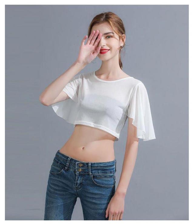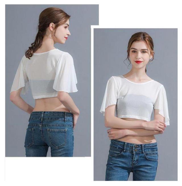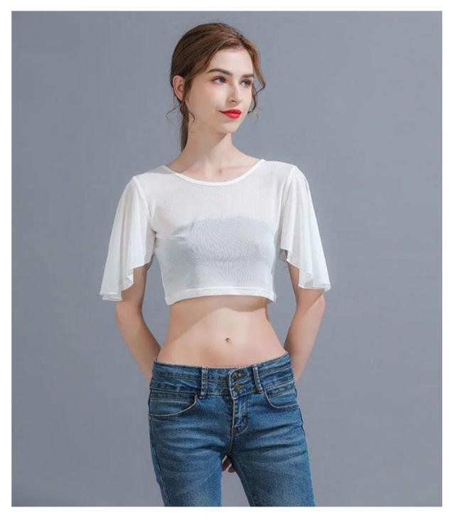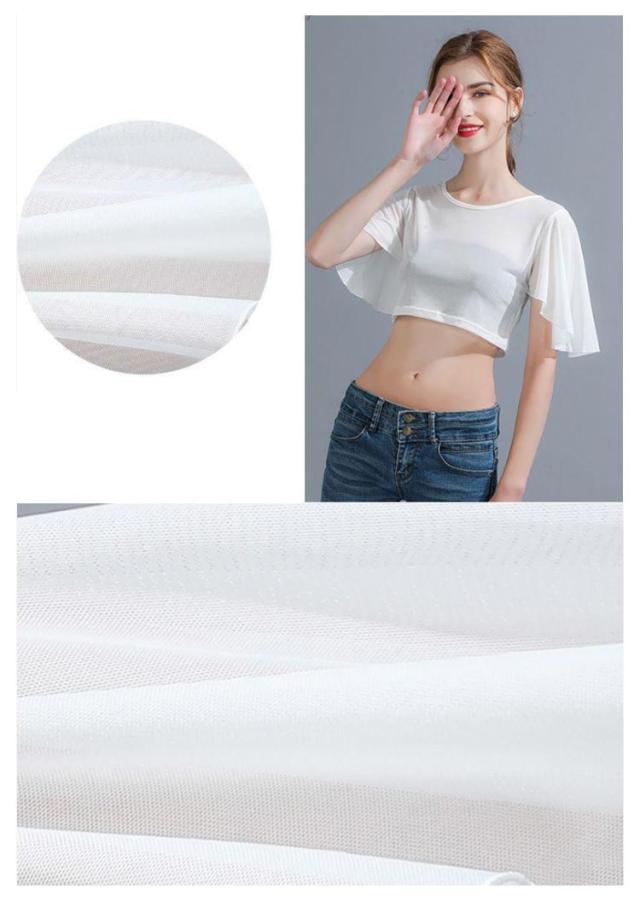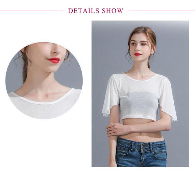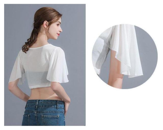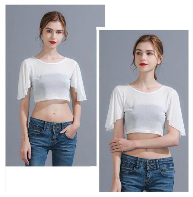 フリル 隠し 重ね着 付け袖 半袖 着痩せ トップス ショート丈 レイヤード レース Tシャツ 薄手 シアー 二の腕 フリル袖 透け感 クルーネック 振り袖 フレアスリーブ 体型カバー 二の腕カバー インナー 細見え シフォン 上品
