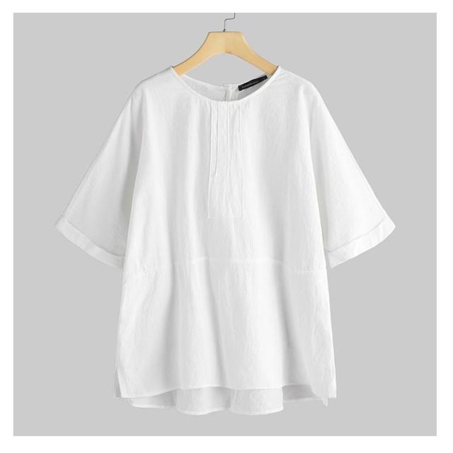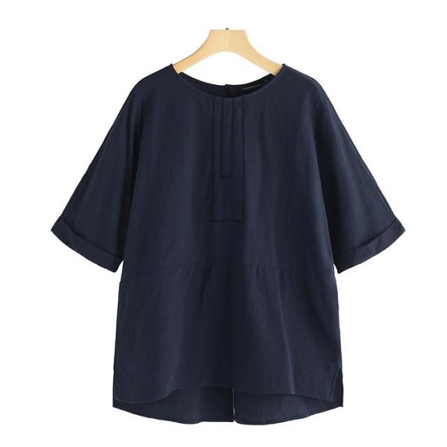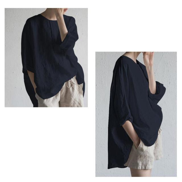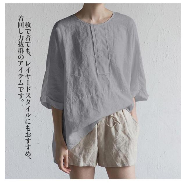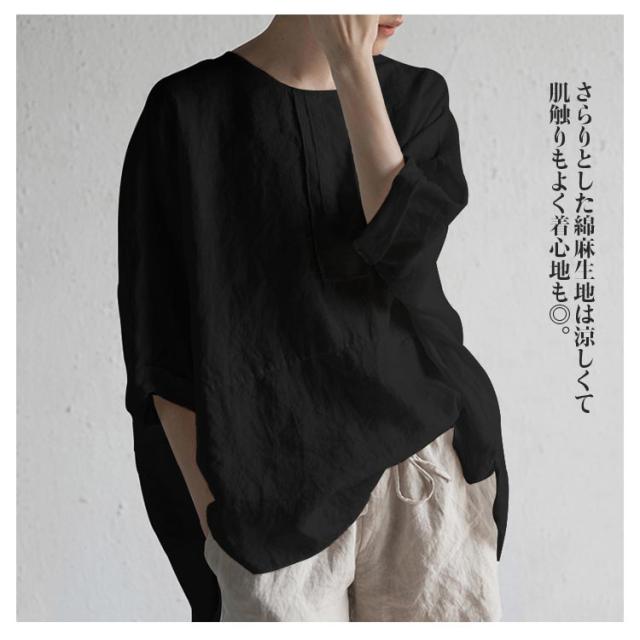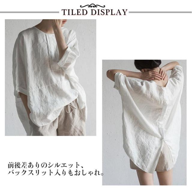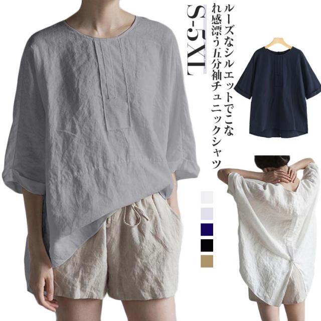 チュニック 綿麻 トップス チュニック 体型カバー 5分袖 ゆったり ブラウス 無地 カジュアル バックスリット 薄手 前後差 シンプル 大きいサイズ 30代 40代