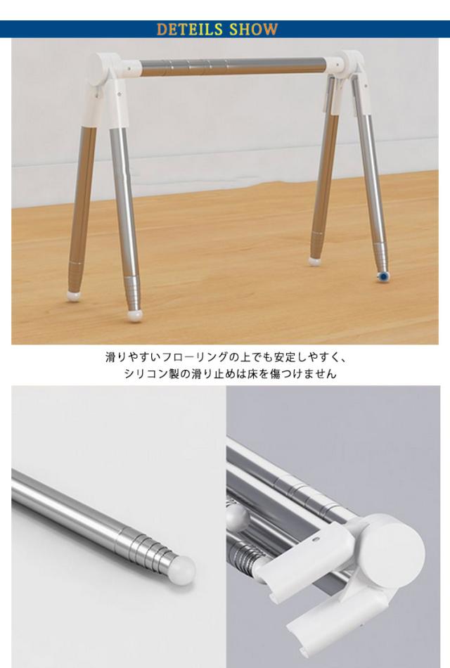 | 引っ張るだけの簡単組み立て!いつでもどこでも洗濯物を干すことができます。 縦にも横にも伸縮自在、省スペースでも設置可能です。 折りたたむと小さくなるため、使わないときでも場所をとりません。 滑りやすいフローリングの上でも安定しやすく、シリコン製の滑り止めは床を傷つけません。 平日の衣類干すとか、ベランダの小さい家庭には最高のおすすめ。梅雨時期や花粉にお悩みの方の部屋干し対策に。 持ち運びをしやすいように専用の収納袋が付属しています。出張、旅行、ホテル、キャンピングなどにご利用できます。 | |