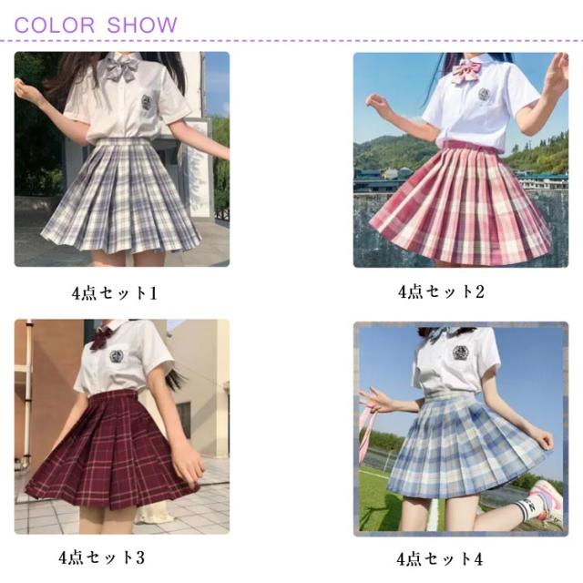 | 【セット内容】半袖シャツ+プリーツスカート+蝶結び+靴下。 幅と間隔が等しいプリーツは、スカートの揺れをより自然で美しくします。チェック柄は清純と復古を持ちます。 学園祭、コスプレ、撮影、仮装パーティー、お祭り、日常などの場合でも似合いますよ。 | |