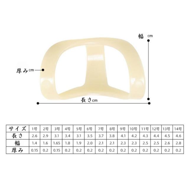 | サイズについての説明 | 1号:長さ2.6cm 幅1.4cm/ 2号:長さ2.9cm 幅1.6cm/ 3号:長さ3.1cm 幅1.65cm/ 4号:長さ3.4cm 幅1.8cm/ 5号:長さ3.1cm 幅1.9cm/ 6号:長さ3.5cm 幅2.0cm/ 7号:長さ3.7cm 幅2.1cm/ 8号:長さ3.8cm 幅2.1cm/ 9号:長さ4.1cm 幅2.3cm/ 10号:長さ4.2cm 幅2.3cm/ 11号:長さ4.3cm 幅2.5cm/ 12号:長さ4.4cm 幅2.5cm/ 13号:長さ4.5cm 幅2.6cm/ 14号:長さ4.6cm 幅2.8cm/ ※サイズ計測には誤差が生じます。 |