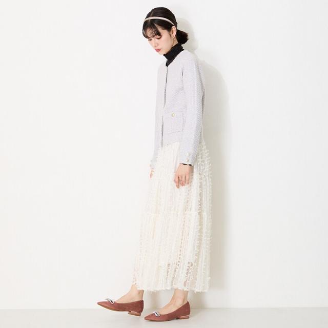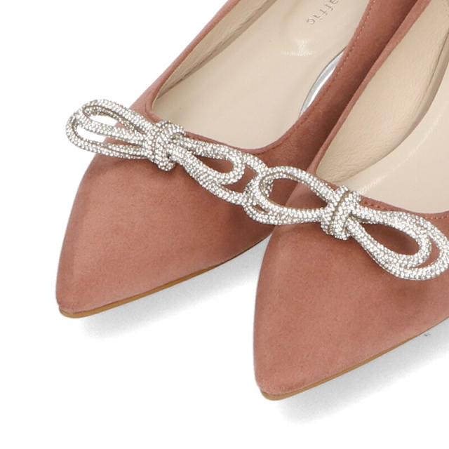 トレンドのリボンモチーフをラインストーンでアップデートしたパンプスは、あえて落ち着いたカラー展開にすることでキラキラのラインストーンが引き立つ印象に。