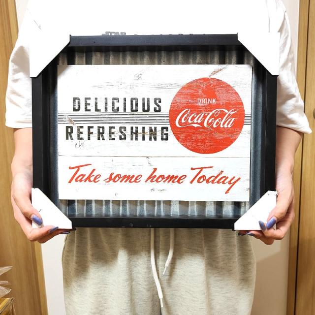 コカコーラ メタル サインボード アンティーク 木製フレーム COCA COLA ロゴ コルゲート 看板 トタン おしゃれ アメリカン