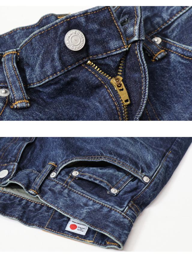 【素材】 カイハラ社と共同開発した綿100%の13.25ozのデニムを使用。経糸は二種類のムラ糸をランダムに配列。加工表現に最適な粗野感・表面感が感じられる生地です。穿くほどに体になじんでいくオリジナル素材。