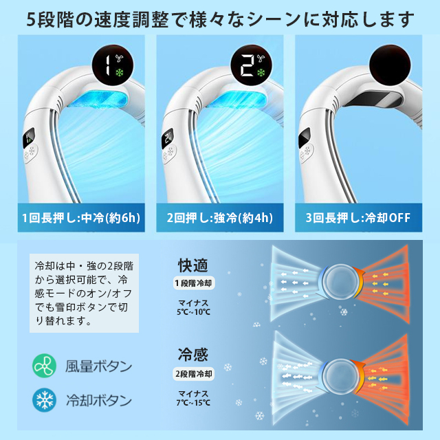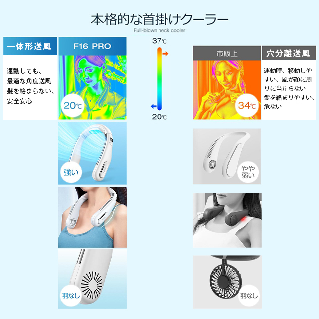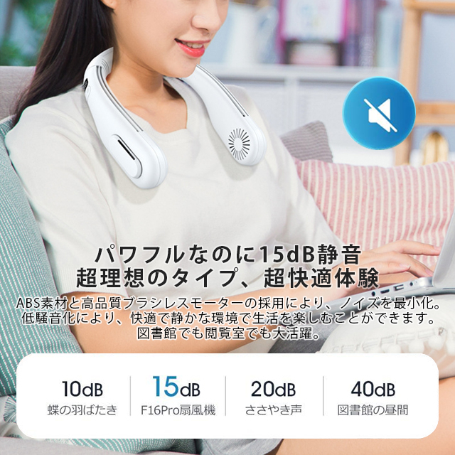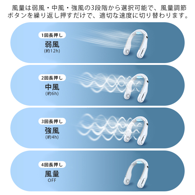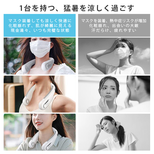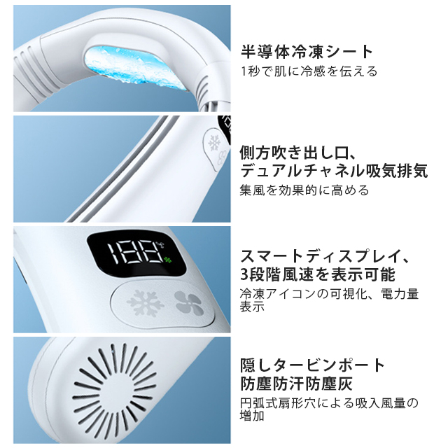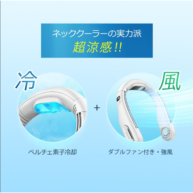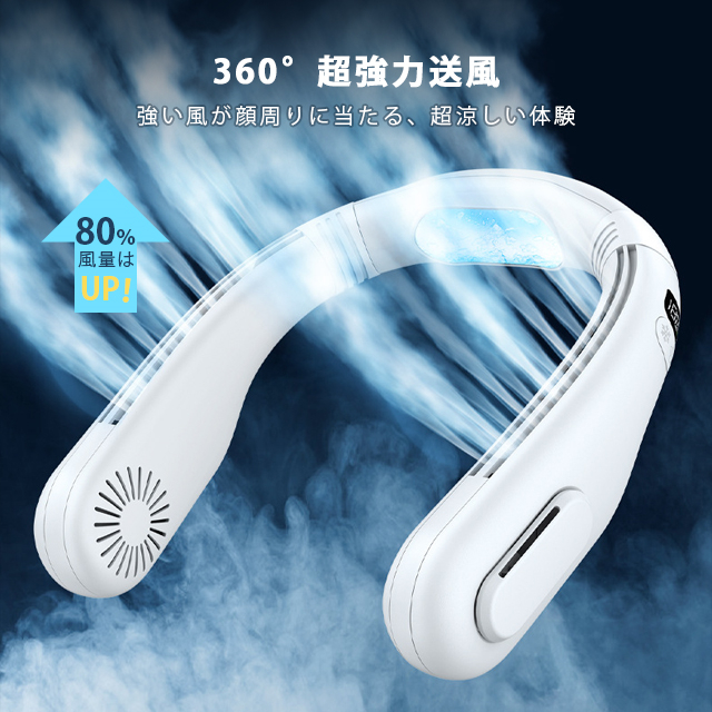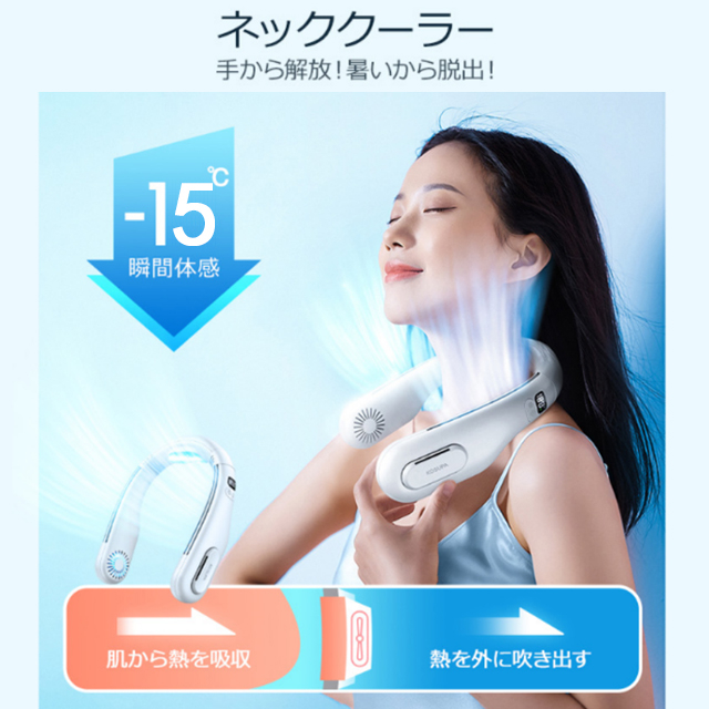 | 特徴 | ◆【人間工学設計】人間工学に基づいた流線型のデザインをされたこのくびかけ扇風機は肩や首にかかる負担が軽減されています。 ◆【羽なし首掛け扇風機 涼感プレート】首かけ扇風機は羽のない安全設計がされており、髪の毛を巻き込む心配がないので安心して使用することができます。また、首かけタイプのデザインなので、両手が自由に使えます。 ◆【静音設計& 360°送風】静音設計を採用し、オフィスや図書館などの静かな場所でも周囲の人に気兼ねなく使用できます。 ◆【11時間連続使用&LCD液晶ディスプレイ】電池切れの心配いりません!大容量の3000mAhバッテリーを搭載し、1日中の連続使用が可能です。LCD液晶ディスプレイにより、現在のバッテリー残量を一目で確認できますので、外出先やイベント会場での使用でも安心です。 |