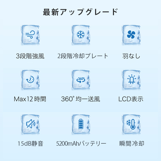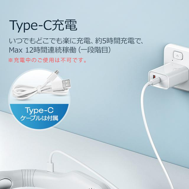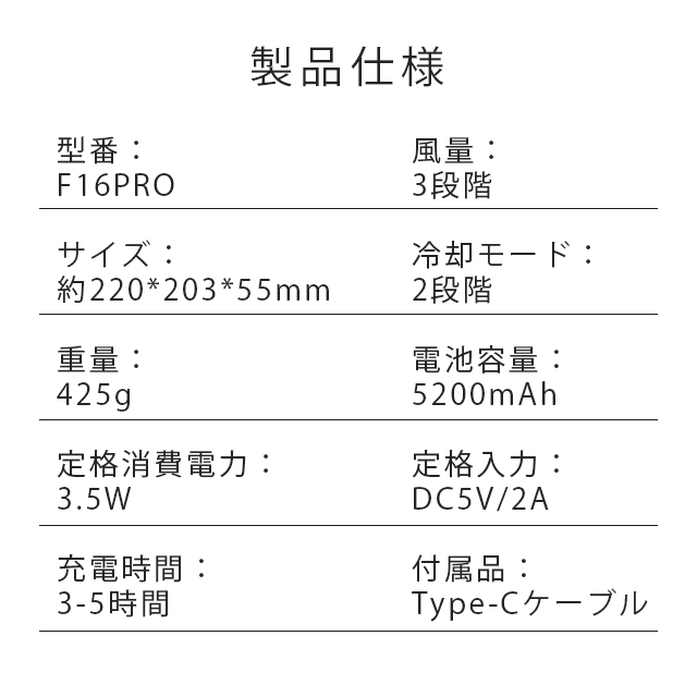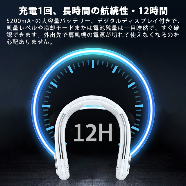 | バッテリー容量 | ◆電池容量:5200mAh ◆風量:3段階 ◆充電時間:3-5時間 ◆満充電使用可能時間最大12時間 ◆お使いになられる環境や充電具合によっては前後する可能性もございます。ご了承ください。 |