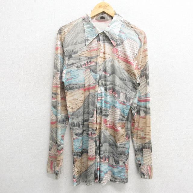 古着 長袖 シャツ メンズ 70年代 70s ベージュ カーキ Mサイズ 中古 トップス 中古 古着