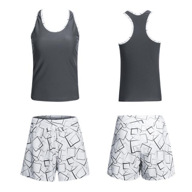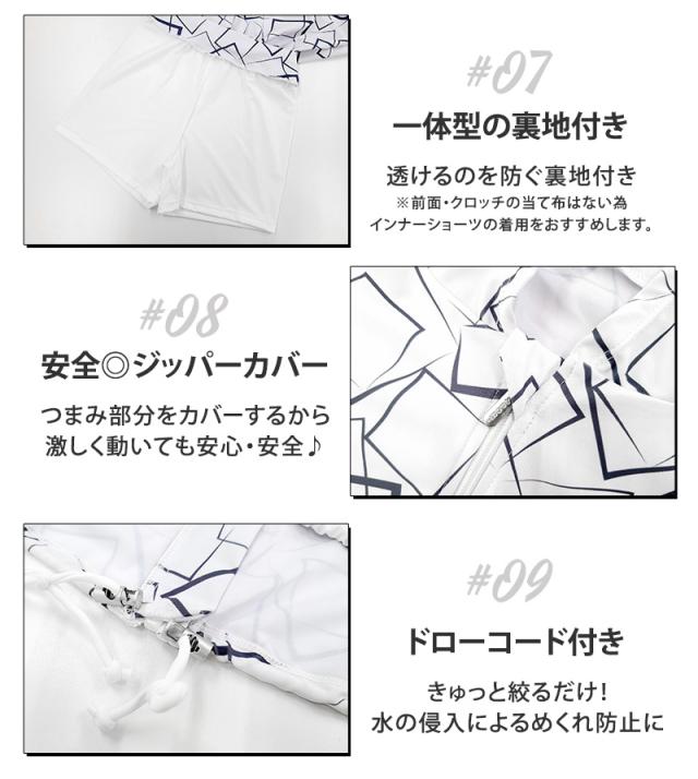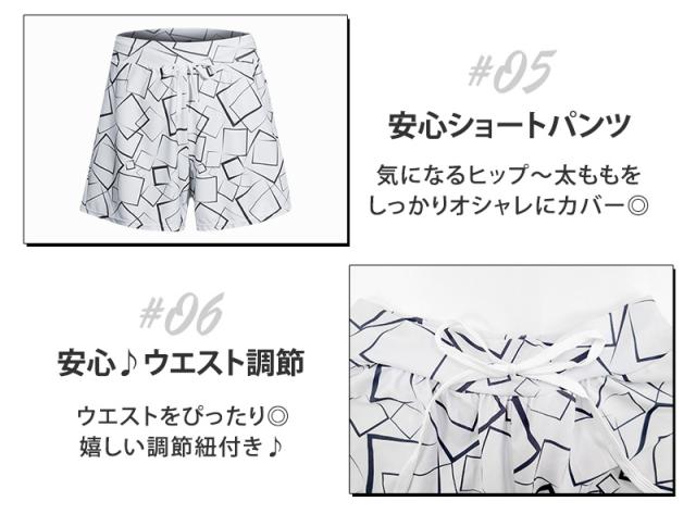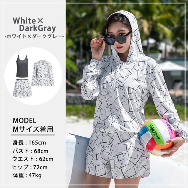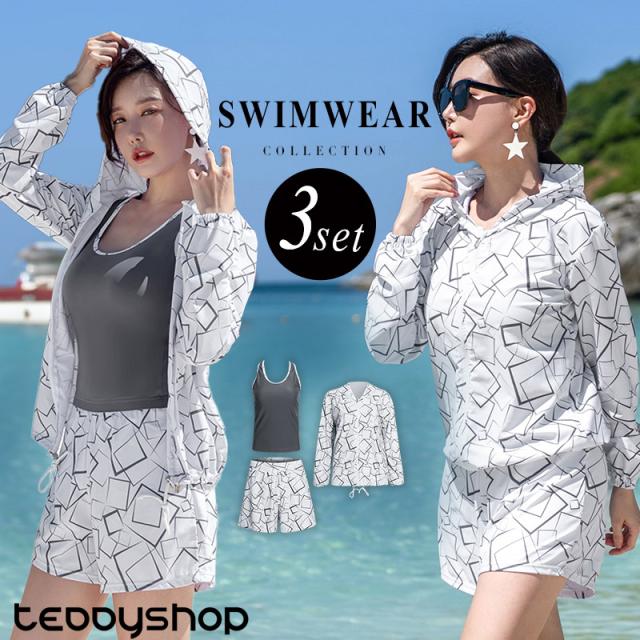 タンキニ 水着 レディース 体型カバー 長袖ラッシュガード フード付き 3点セット ミセス ママ水着 セパレート ジップアップ ショートパンツ 裏地付き 一体型 透け防止 ウエスト紐調整 幾何学 二の腕 ウエスト ヒップ 太もも カバーアップ