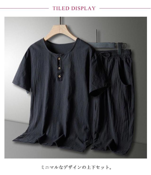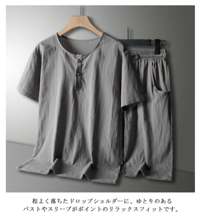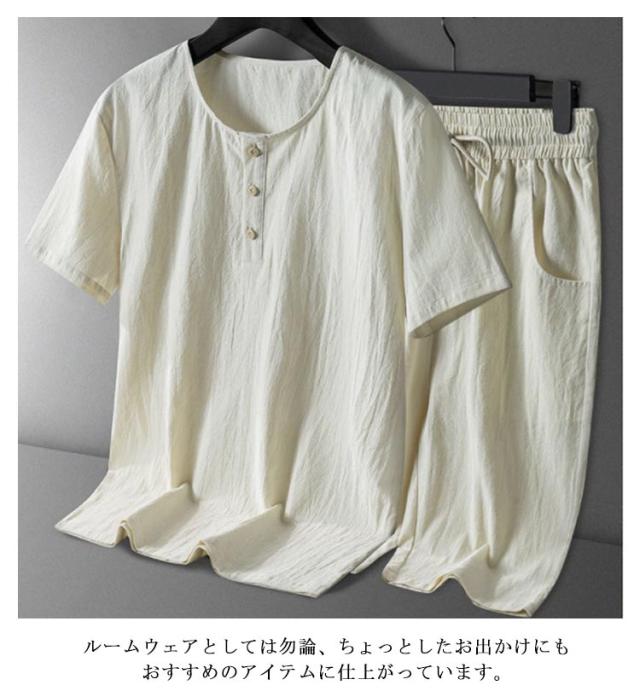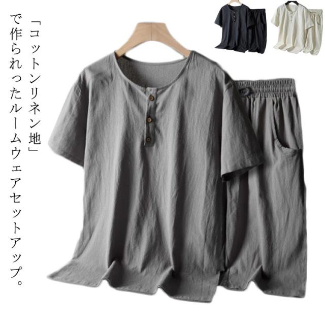 ルームウェア セットアップ 半袖 短パン ハーフパンツ 男性 夏 ルームウェア パジャマ ナイトウェア 上下 セット 部屋着 メンズ 寝間着 ショートパンツ リネン混 2点セット 綿麻 薄手 ゆったり 涼しい 通気性 無地 シンプル tシャツ L XL 2XL 3XL