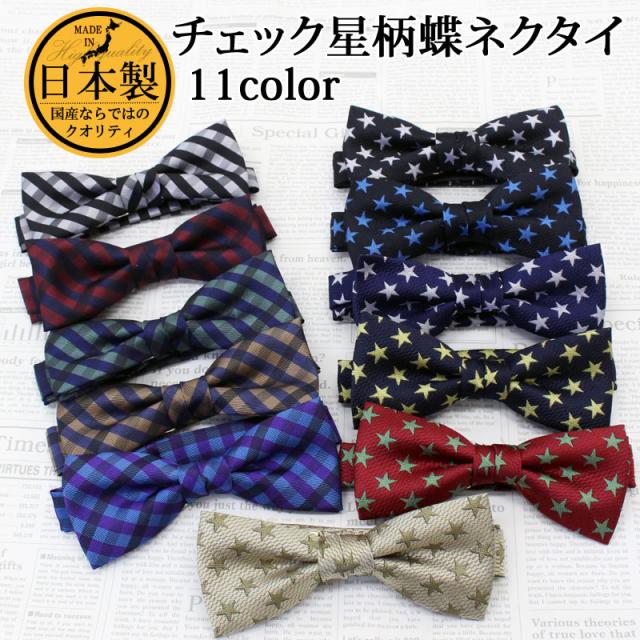 送料無料 日本製 チェック 星柄 蝶ネクタイ ボウタイ メンズ レディース 男女兼用 結婚式 シンプル おしゃれ ポイント消化 ゆうパケ